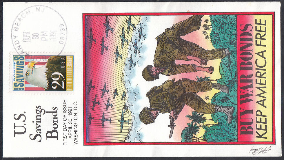 This COLLINS is a solid philatelic item. A very colorful military cachet done in the style of a promotional poster for the sale of war bonds. A well designed stamp, with eagle, commemorating the 50th Anniversary of U.S. Government savings bond sales. And, an outstanding First Day postmark from Normandy Beach, N.J. Item #P1801. $9.50.