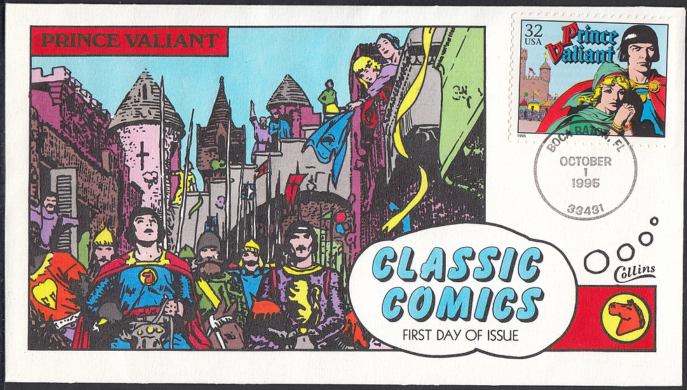 With these three FDCs you watch Dick Tracy pursue the criminal Bronzen; Dagwood pursue his famous sandwich; and Alley Oop pursue a mischievous dinosaur. Classic Comics. $10.75. each.